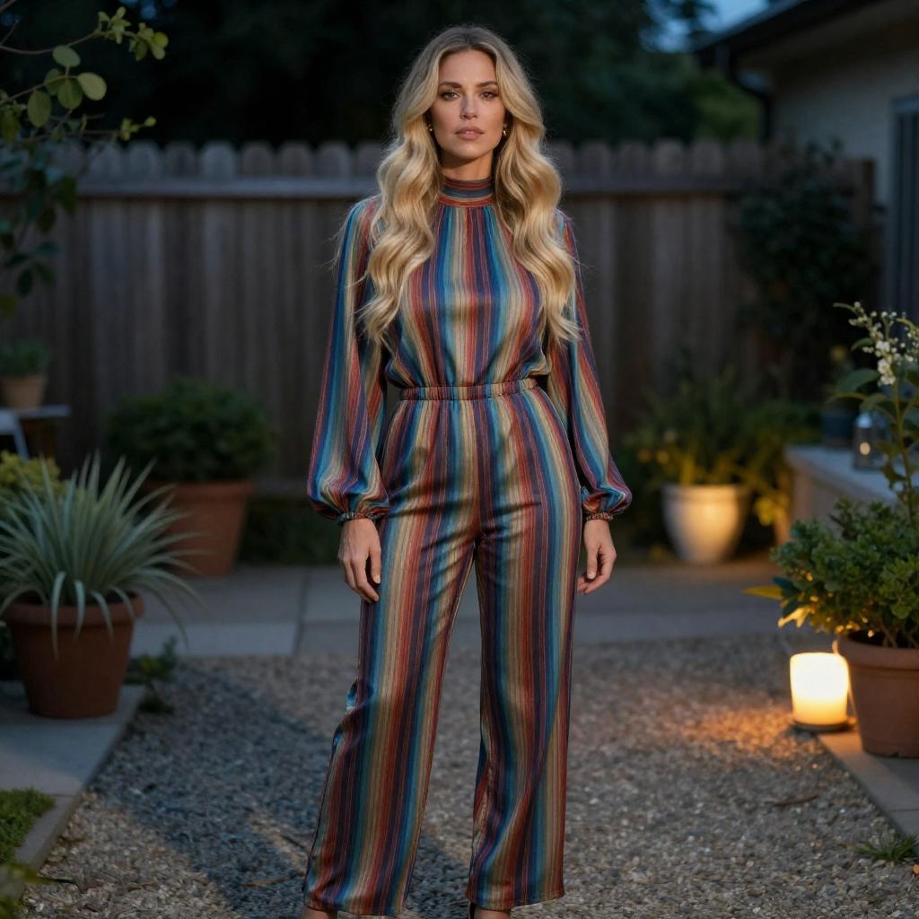Photograph of a woman with long, wavy blonde hair standing in a dimly lit garden at night. She wears a colorful, striped, long-sleeve jumpsuit with a high neckline and wide sleeves. The background includes a wooden fence, potted plants, and glowing yellow lights. Her expression is neutral, and she stands on a gravel path.