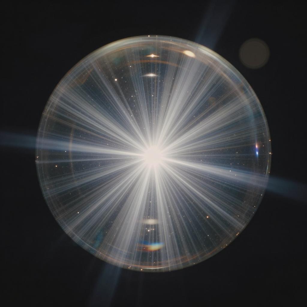 A high-definition surreal image featuring a large round transparent glass sphere illuminated by radiant, shimmering light rays forming a starburst pattern. The background is dark and complemented by subtle bokeh effects, emphasizing the mystical and ethereal quality of the light. The image combines elements of double-exposure and studio lighting for a dramatic, otherworldly effect.
