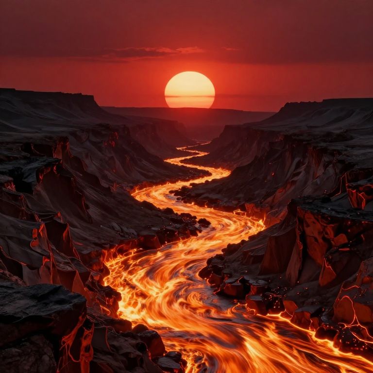 This digital artwork depicts a surreal, fiery landscape at sunset. A vividly glowing, orange-red lava river snakes through a rugged, dark canyon, illuminating jagged rock formations. The bright, spherical sun is a deep red, casting a dramatic, reddish-orange sky. The canyon's silhouette contrasts sharply against the intense colors of the lava and sky, creating a striking, otherworldly scene. The texture of the lava appears fluid and dynamic, while the rocks are rough and uneven. The overall composition emphasizes the intense heat and vibrant colors of this fantastical environment.