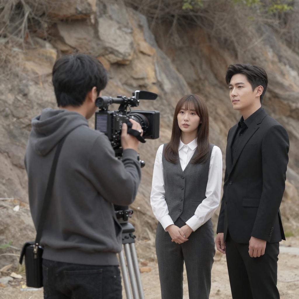 Photograph of a film set. A cameraman with dark hair and a gray hoodie operates a camera, while a woman with brown hair in a white blouse and gray vest stands beside a man with dark hair in a black suit. They are in front of a rocky hill.