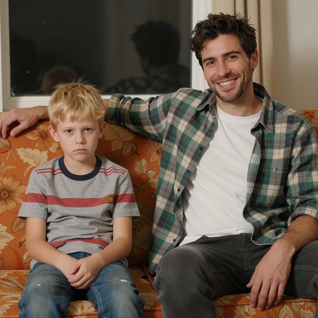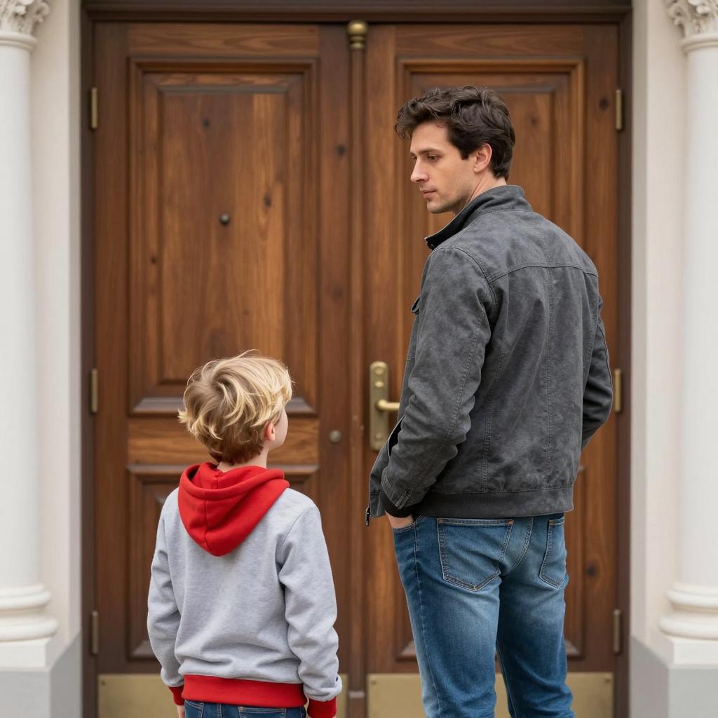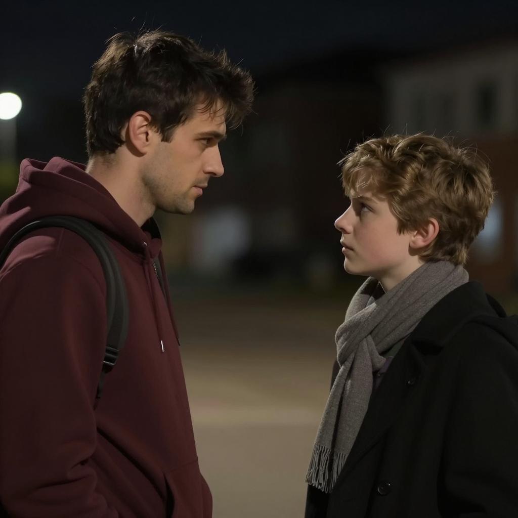 Two men in a nighttime scene. Adult man with short dark hair, maroon hoodie, facing boy with light brown hair, gray scarf, black coat. Intense eye contact. Background: dark, out-of-focus street lights. Adult man on left, boy on right.