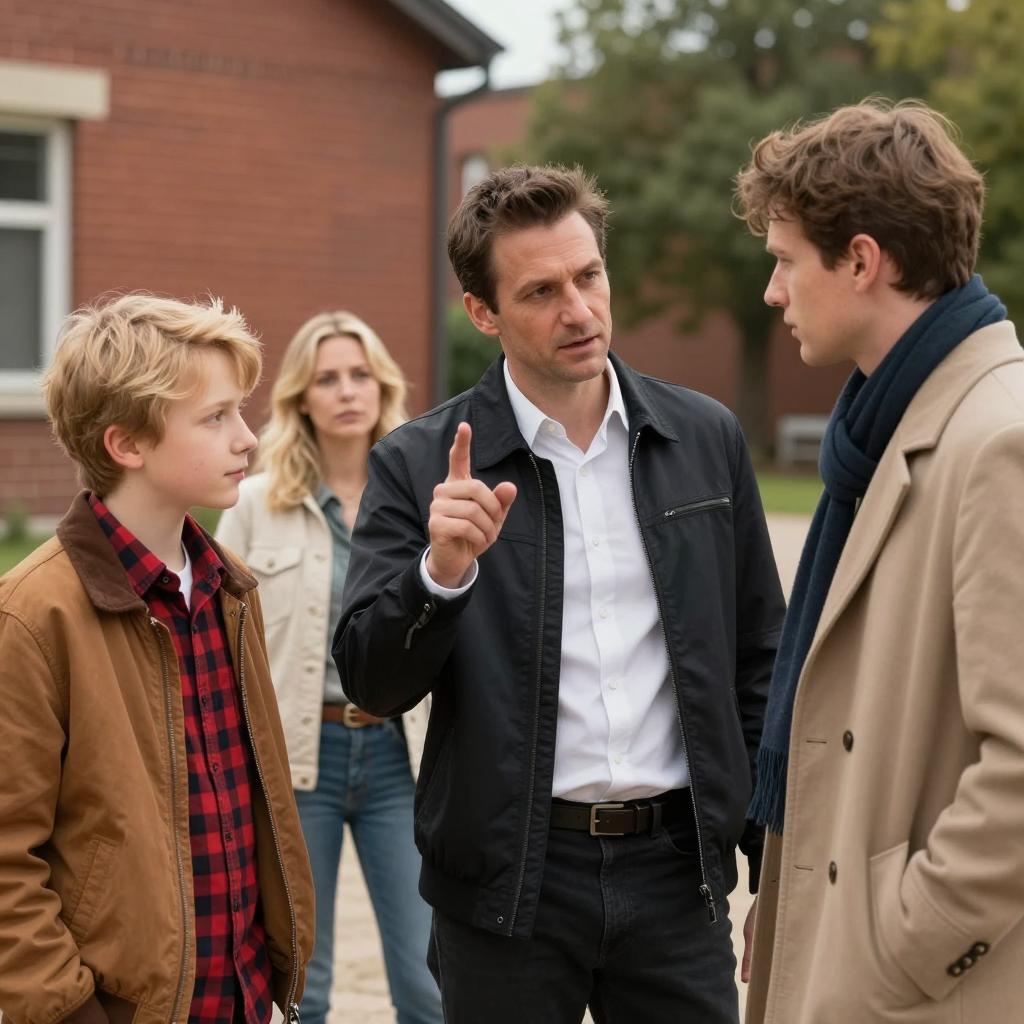 An adult man with short dark hair wearing a maroon hoodie and a backpack facing a teenage boy with light brown hair dressed in a gray scarf and black coat. Both are outdoors at night, making intense eye contact, with blurred street lights in the dark background.