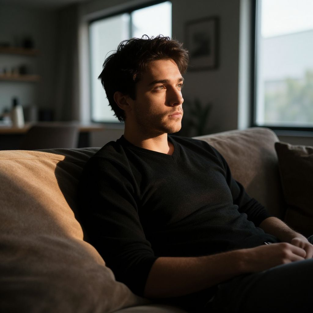 Intimate scene of a man sitting on a plush couch, surrounded by soft furnishings and modern decor. Large windows allow natural light to flood the space, casting warm rays across his face. Volumetric lighting creates dramatic shadows, accentuating his features. He gazes thoughtfully into the distance, lost in contemplation. Cozy atmosphere filled with ser Man has masculine face and piercing eyes