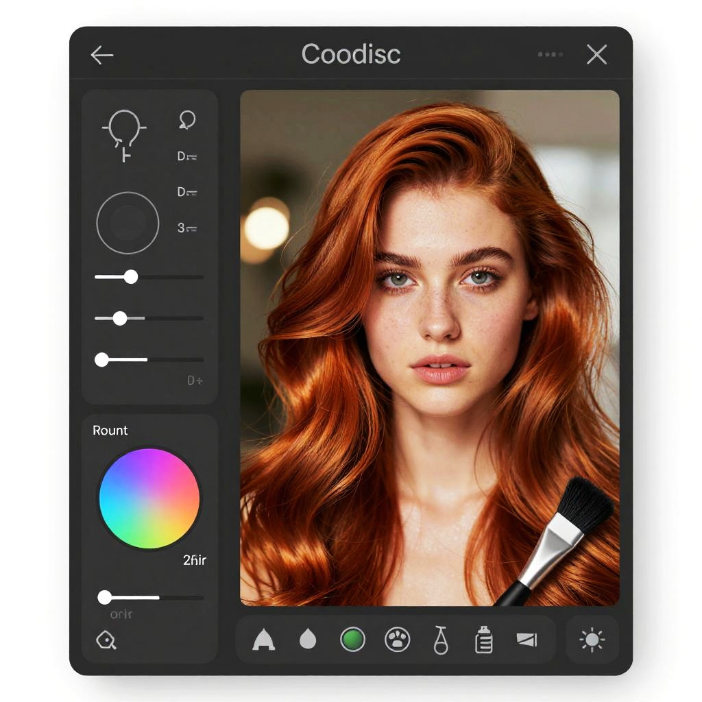 Photo hair editor interface showing advanced digital tools editing vibrant, detailed strands of hair in a high-resolution portrait, realistic lighting with soft bokeh background, modern UI design with color adjustment sliders and brush tools, ultra realistic style