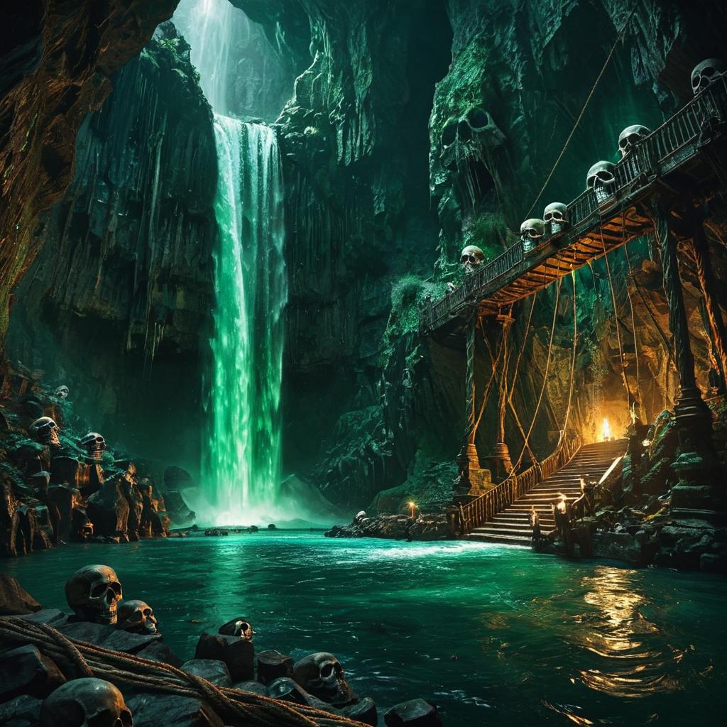 Emerald Waterfall in Dark Cavern with Skull-Decorated Rope Bridge