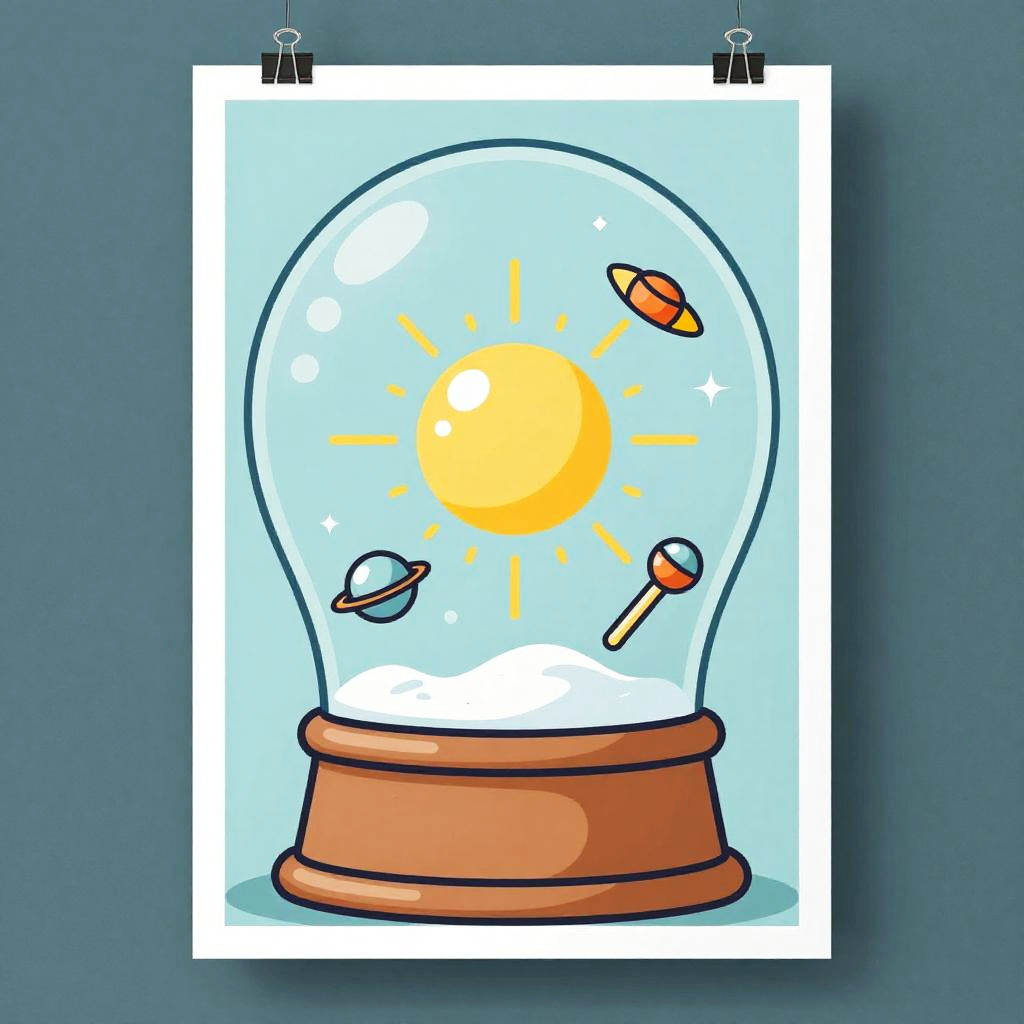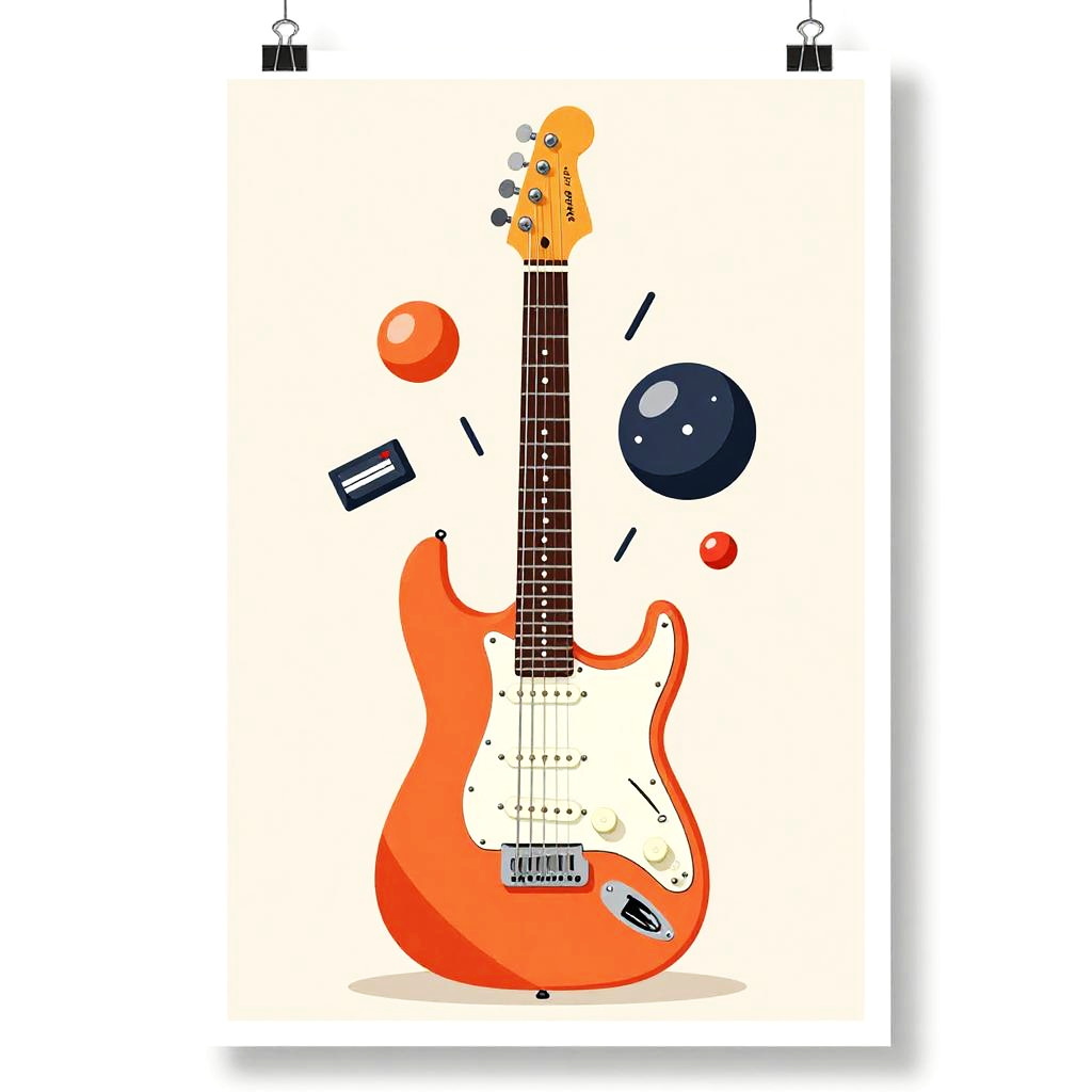 Electric Guitar poster with a flat single-color background, shown in zero gravity with components not perfectly stacked, flat cartoon illustration style