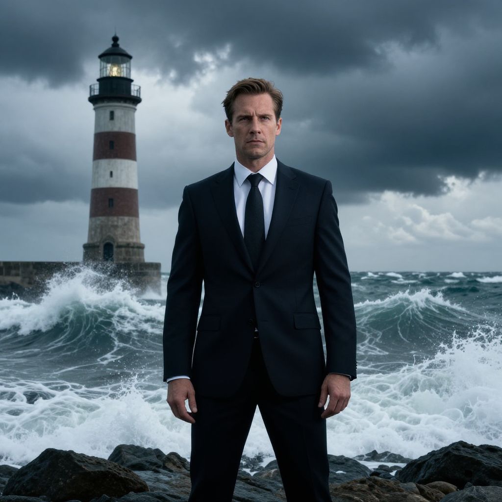 A sharply dressed man in a dark suit stands resolutely against the backdrop of a turbulent sea and a towering lighthouse under a stormy, cloud-filled sky. The dramatic lighting and intense waves create a powerful, cinematic atmosphere emphasizing strength and determination.