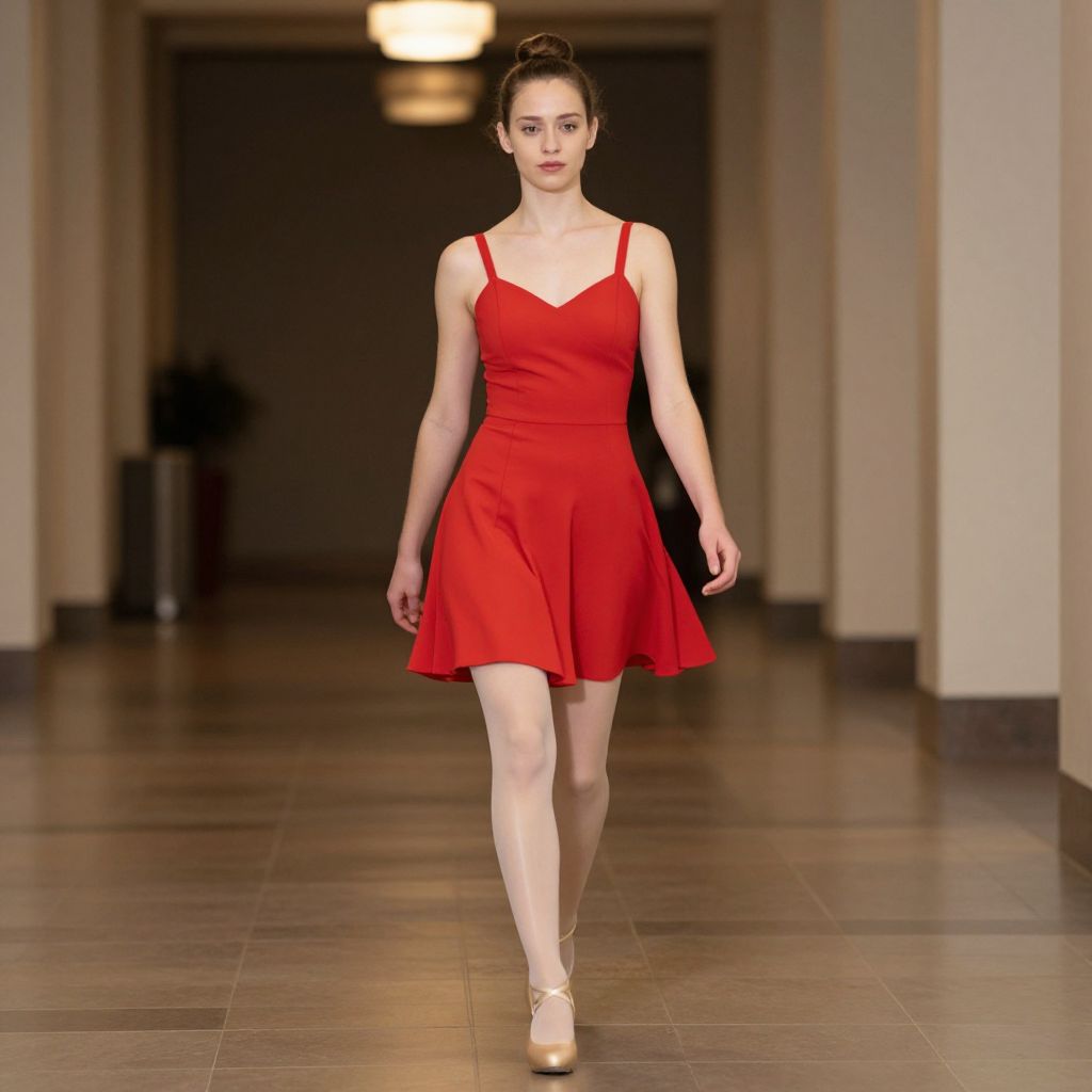 Groovy Dancer Costume, dressed in a red dress walking down a hall