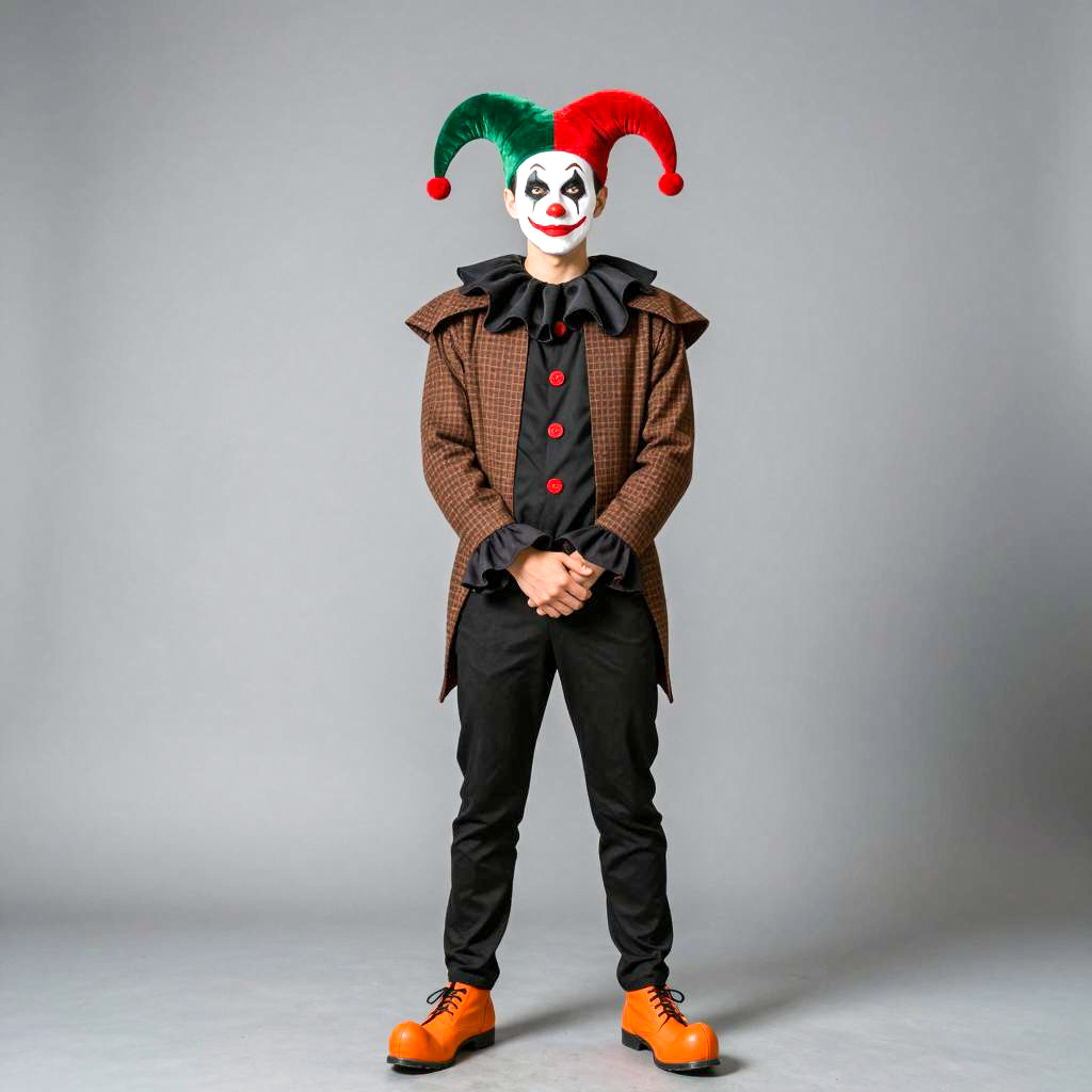 Bad jester costume, realistic digital portrait of a jester, standing, white face with red clown makeup, black eyebrows, jester hat with green and red points, brown checkered jacket with red buttons, black shirt with ruffled collar, black pants, orange shoes, hands clasped in front, neutral grey background, front view, slight shadowing, realistic ure, full body, fantasy character, minimal background elements, 3/4 length shot