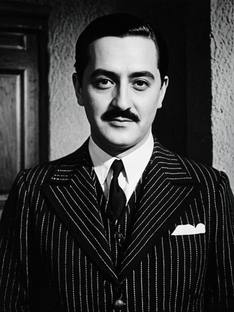 Man in Gomez Addams costume, cosplay editorial photography, realistic tones