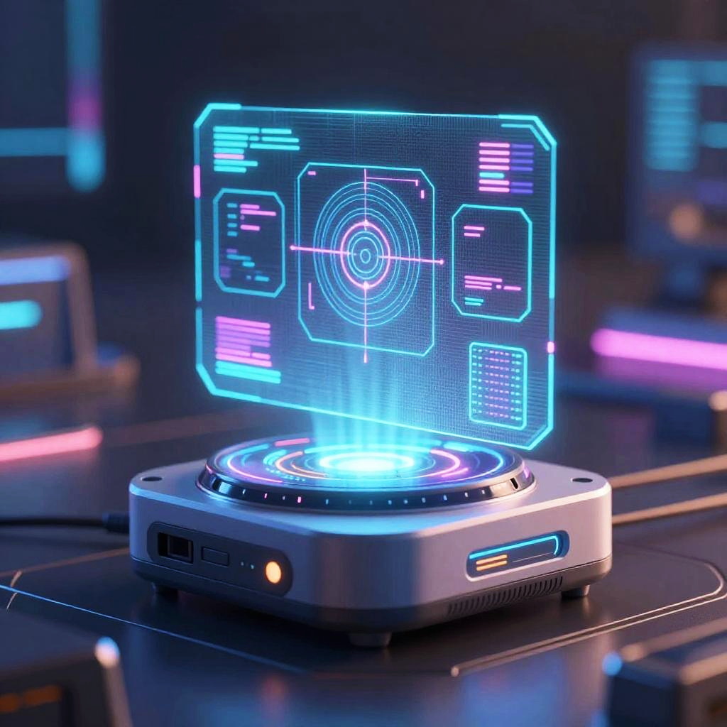 Quality enhancer device, a compact futuristic machine emitting holographic screens and sensors, boosting image resolution and color vibrancy, set in a sci-fi environment filled with floating data streams, photorealistic style with neon color palette