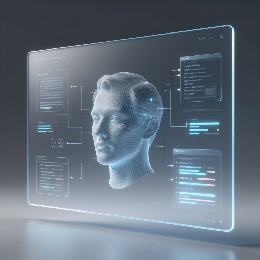 This is a digital CGI image depicting a high-tech interface with a glowing, blue-lit screen displaying a detailed, three-dimensional, wireframe head of a Caucasian man with short, neatly combed hair. The screen's background is dark, enhancing the luminous, futuristic design elements, including various text boxes, lines, and codes in white and blue. The man's head is centered on the screen, surrounded by technical information and interface elements, suggesting a 3D modeling or AI-generated portrait. The overall aesthetic is sleek and modern, with a focus on technology and digital design.