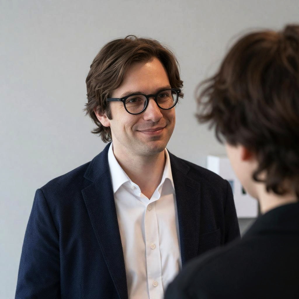 Photograph of two people in a bookstore. A woman with glasses, brown wavy hair, white blouse, and navy sweater smiles, gesturing with her right hand. A man with short gray hair, gray plaid blazer, black turtleneck, and white shirt smiles, holding a glass in his right hand. Bookshelves with "Ashes to Dust" books in the background. Table with books in front. Both standing, facing each other.