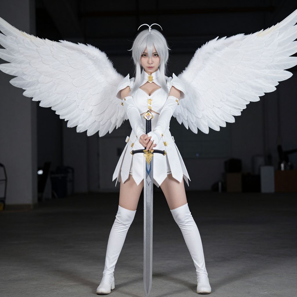 "Wing Cosplay, woman dressed in white with wings and a sword"