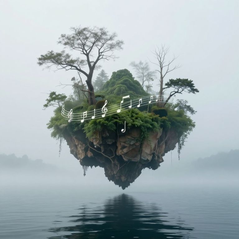 Suspended above a tranquil sea, a verdant floating island cloaked in mist and adorned with bare trees and cascading musical notes hovers serenely, its ethereal presence mirrored by the water below, creating a symphony of harmony and mystery.