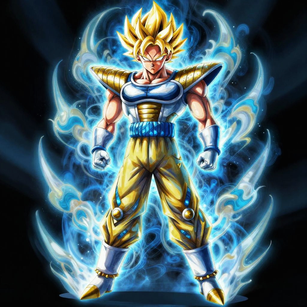 Dynamic composition of Vegito outfit inspired by traditional Saiyan armor mixed with organic, flowing energy patterns, radiant blue and gold hues, intricate details on gloves and boots, powerful stance with glowing aura, dramatic lighting and shadow.
