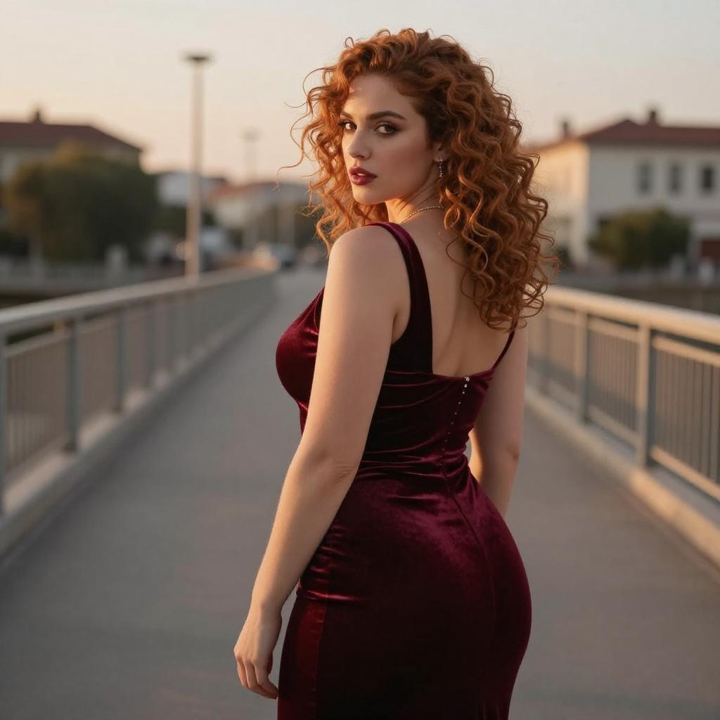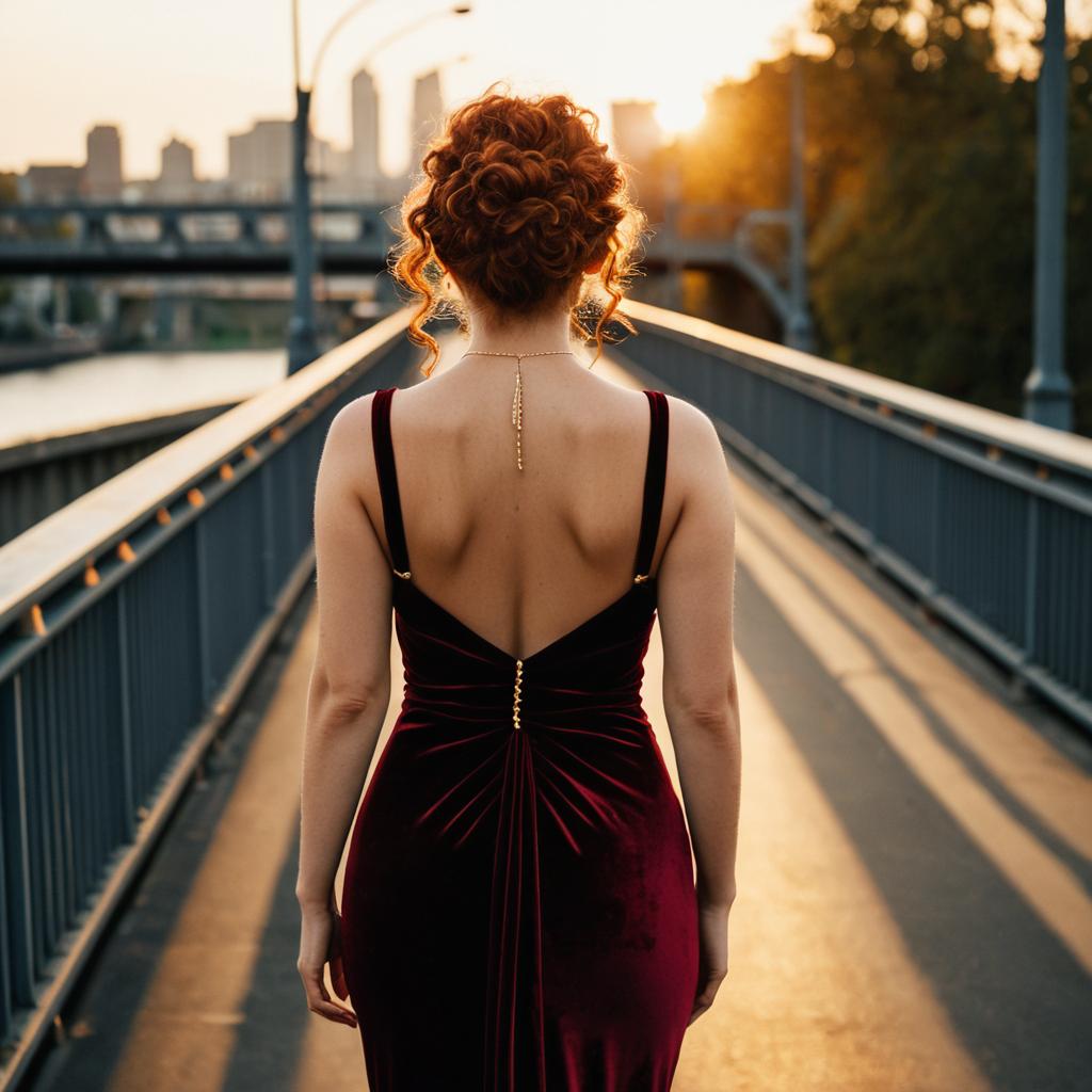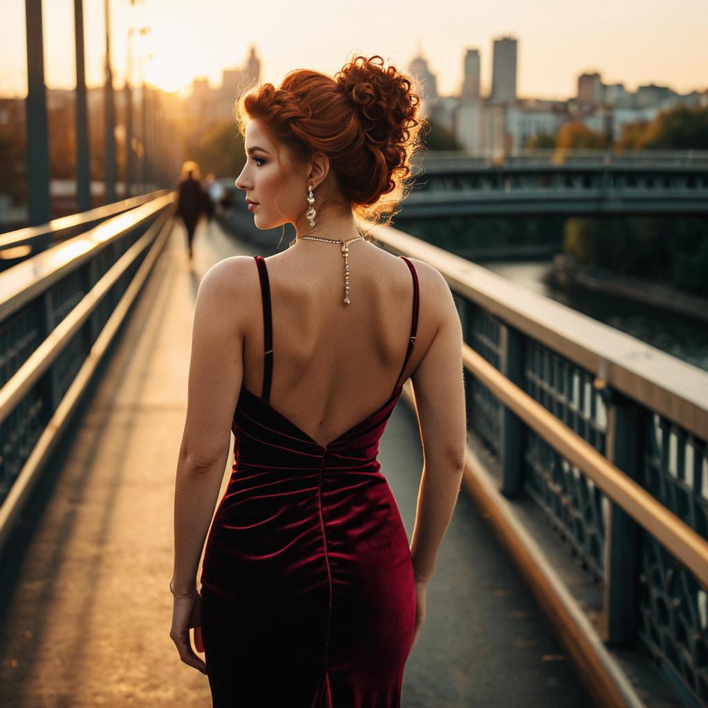 Fashion portrait of woman with curly auburn hair pinned up with a few loose strands in a backless fitted dress, massive tits, standing on an urban bridge at golden hour, body turned away from the camera while looking back over her shoulder, soft warm sunset light, shallow depth of field, cinematic mood, dress in rich burgundy velvet, subtle jewelry, glossy editorial photography