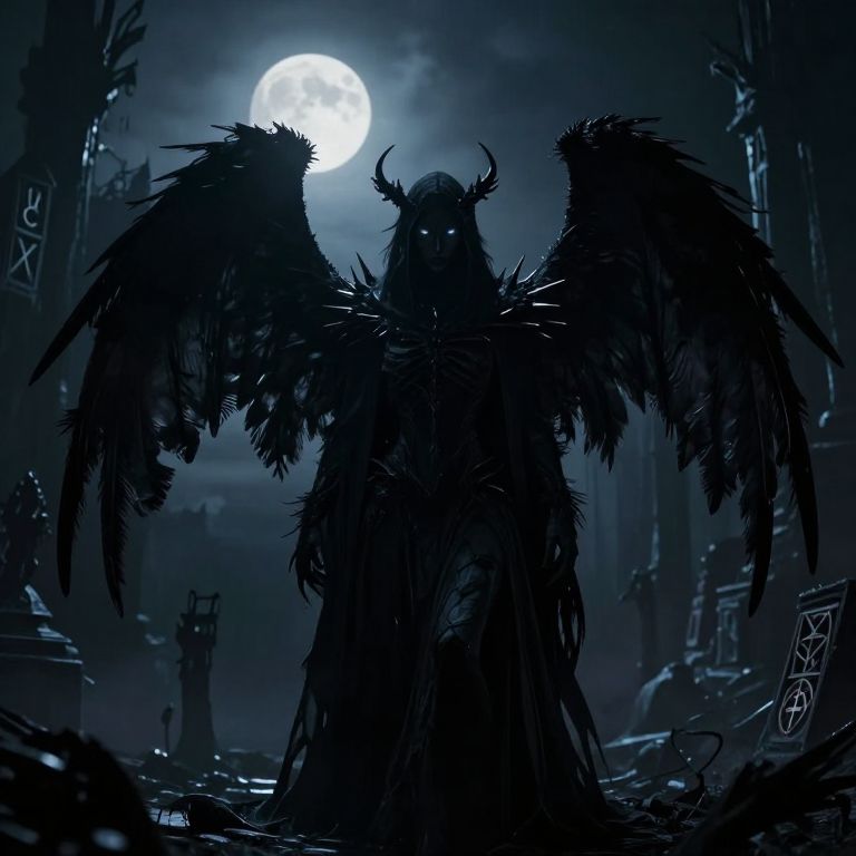 A hauntingly beautiful dark fantasy scene featuring the Angel of Shadows, The fallen angel stands tall in the moonlit desolation, cloaked in a shadowy, almost impenetrable darkness, Glowing, eerie eyes pierce the night, revealing the malevolence within, The angel's twisted, skeletal wings stretch out, adorned with razor-sharp feathers that catch the faint moonlight, Looming behind the figure are ominous, towering structures, casting a foreboding silhouette, Symbols of forbidden knowledge and dark magic are scattered throughout the environment, adding to the sinister atmosphere, cinematic, dark fantasy