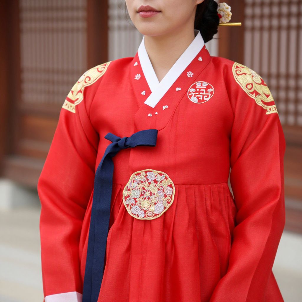 Photograph of an Asian woman wearing a green and white traditional Korean hanbok dress with long sleeves and a large ribbon bow, standing outdoors with a
