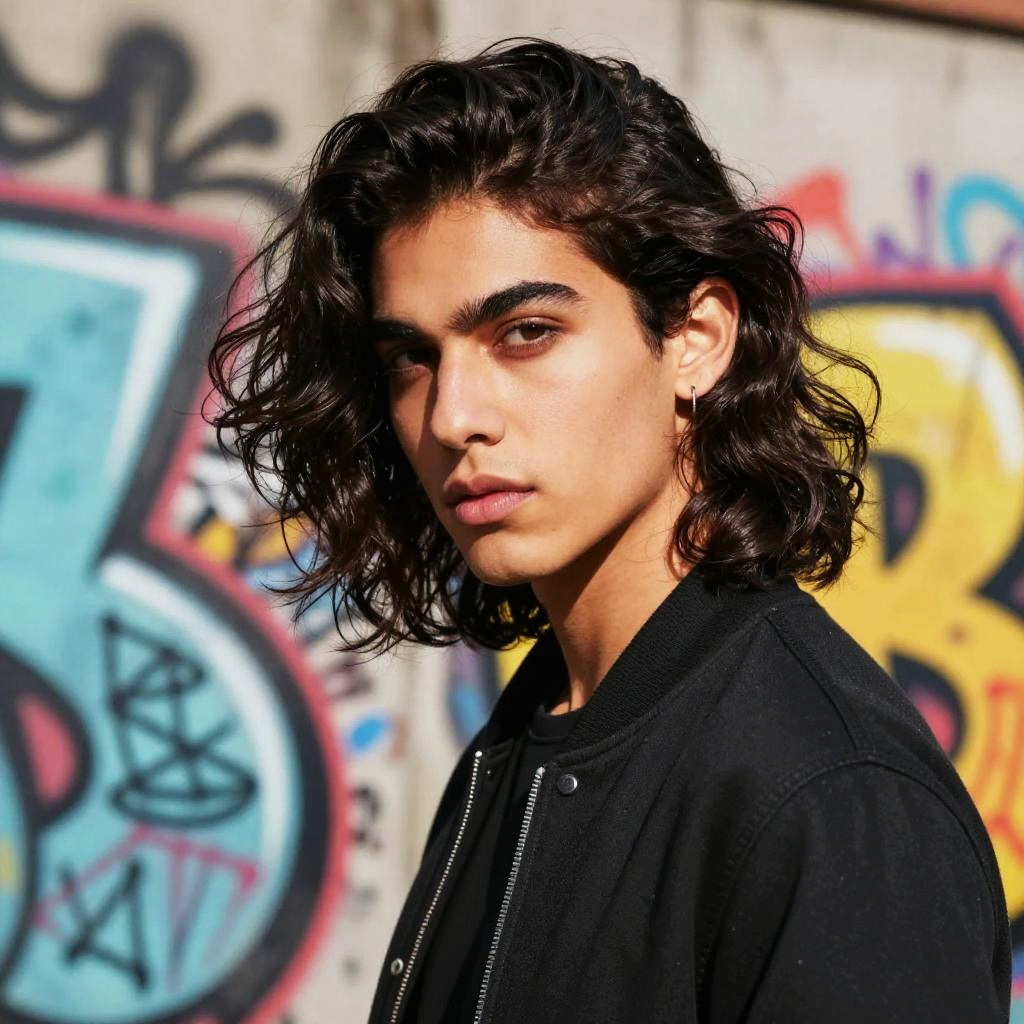 Portrait of a person with shiny dark wavy hair styled loosely, urban street fashion backdrop, vibrant graffiti walls, dynamic composition with contrast lighting and depth