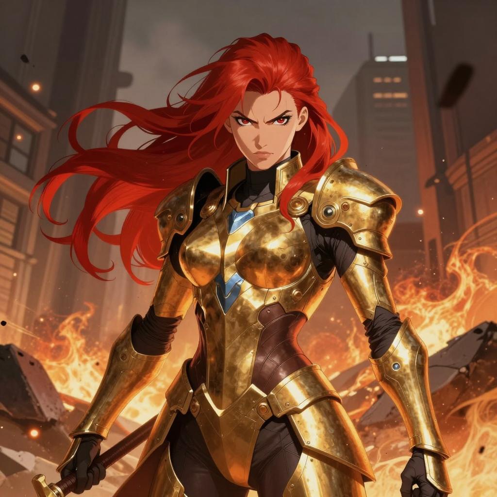 A fierce warrior woman with flowing red hair and intense eyes wearing futuristic golden armor with dark accents, standing in a dramatic war-torn urban environment with rubble and fire in the background, cinematic lighting emphasizing her determined expression, dynamic shading and bold outlines in a comic book style, vibrant red and gold color scheme
