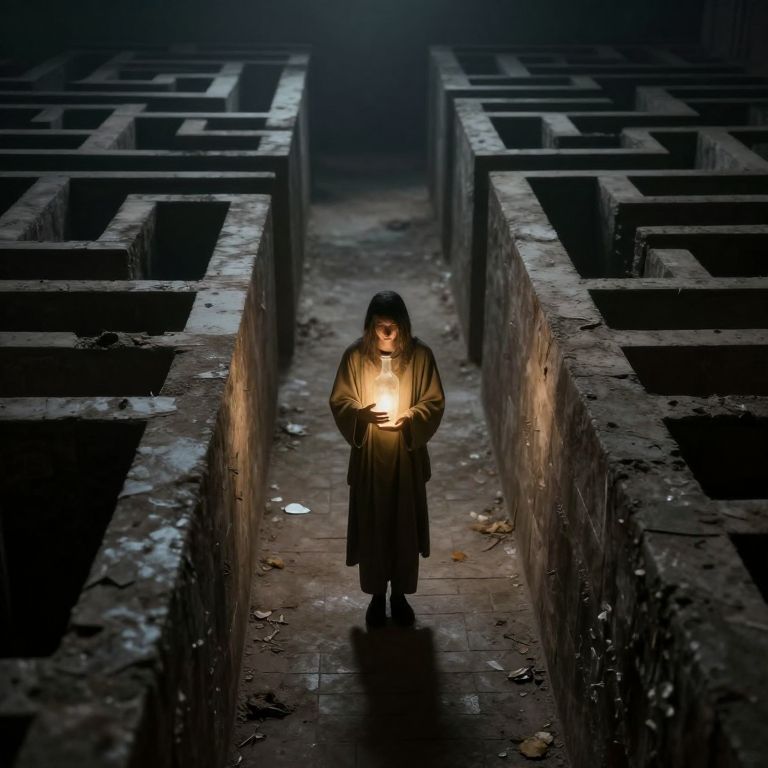 Photograph of a dimly lit, narrow, stone-walled maze. At the center, a hooded figure with pale skin and dark clothing stands, holding a glowing lantern that casts a warm light. The maze's walls are rectangular and slightly weathered, creating a dark, eerie atmosphere. The floor is made of uneven, dark stone tiles, with scattered debris. The background fades into darkness, emphasizing the figure's isolation. The overall mood is mysterious and haunting, with the lantern's light contrasting sharply against the dark surroundings.