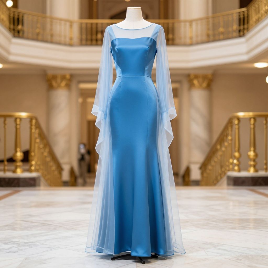 Photograph of a floor-length, blue satin gown with sheer, white long sleeves, displayed on a white mannequin in an opulent, grand