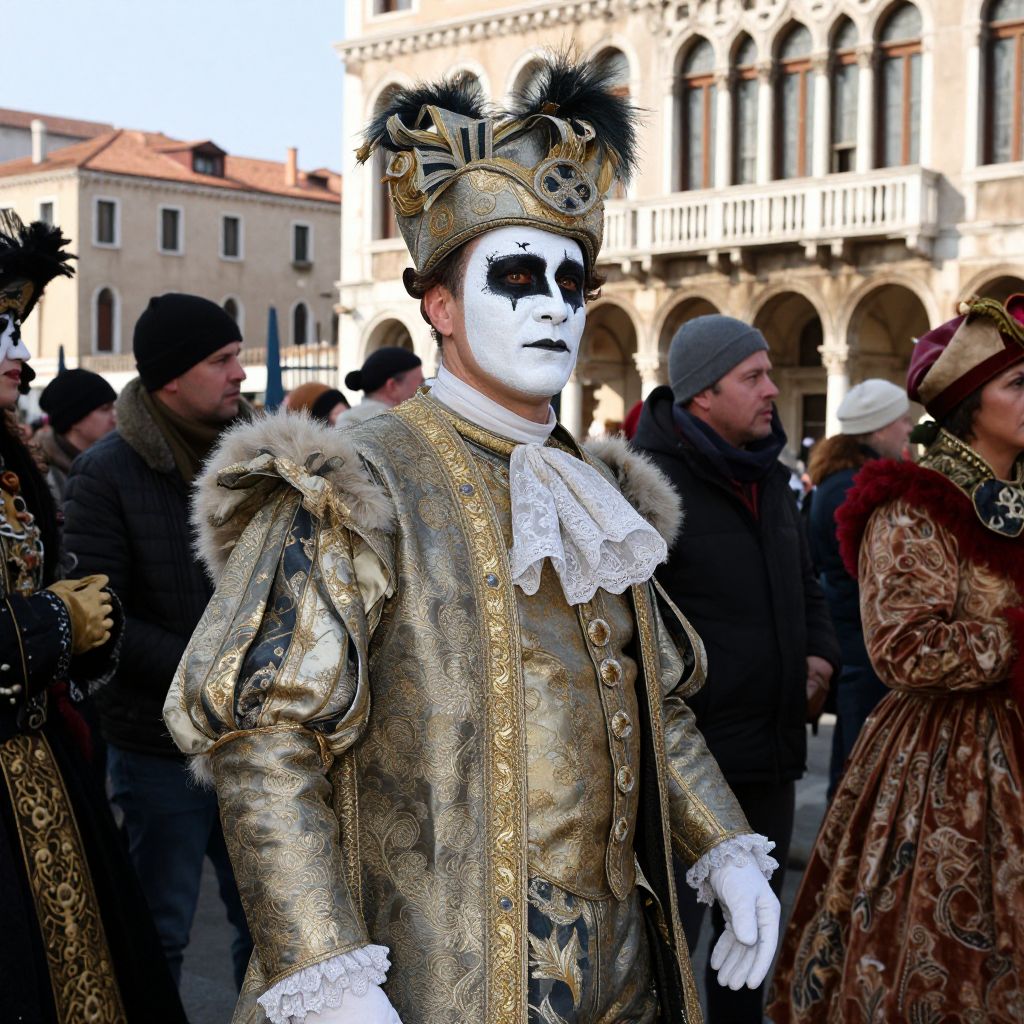 A man in elaborate Baroque attire and face paint stands in a crowded Venetian carnival, surrounded by ornate clothing and architecture.