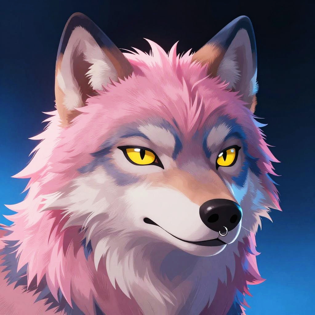 Close-up digital illustration of a pink and blue anthropomorphic wolf-like creature with fluffy fur. The creature has bright yellow eyes, a black nose with a silver piercing, and a white snout. The background is a gradient of blue and black, giving a vibrant, dynamic feel. The fur texture is detailed, with individual strands visible, and the lighting highlights the creature's expressive features.