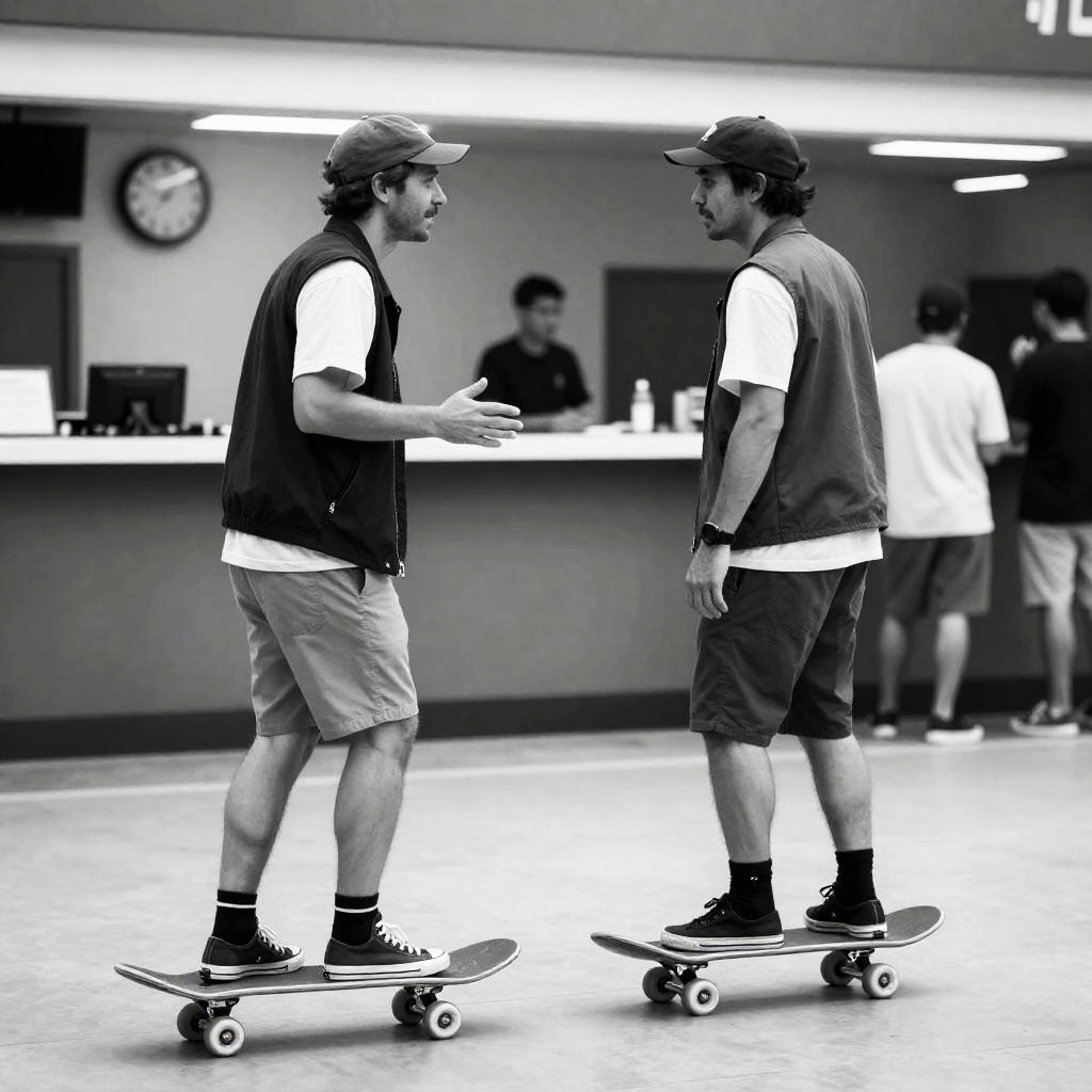 Black-and-white photograph of two men in mid-conversation while skateboarding indoors. Both wear vests, shorts, and caps. One skates on wheels, the other on foot. Background includes a counter, clock, and other people. Men face each other, hands gesturing.