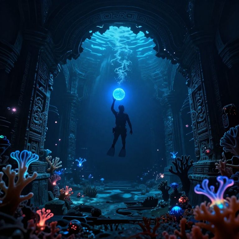 A surreal underwater realm emerges, enveloping viewers in an enigmatic dream world where bioluminescent life thrives among the ruins of an ancient submerged sanctuary. The hollowed remains of this mysterious edifice feature intricate carvings and architectural designs sculpted from translucent black coral, which pulse with eerie light into the surrounding waters. A solitary diver, their form illuminated by a glowing blue sphere held aloft, navigates through this otherworldly space. Their silhouette is distorted by ripples created by their movements, casting unsettling yet captivating shadows on the temple walls as bioluminescent creatures swarm around them, evoking a sense of wonder and unease. This scene is rendered with sharp contrast and vivid hues, each glowing detail captured with meticulous precision under mysterious, atmospheric lighting that intensifies the hyper-realistic effect.