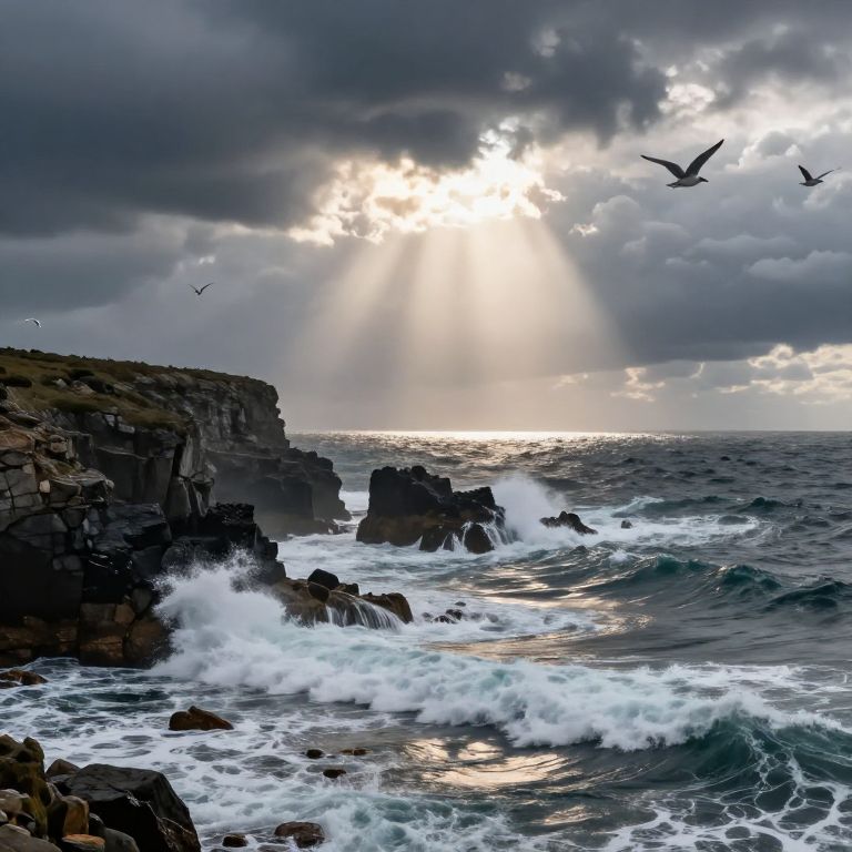 Risco coastal landscape featuring jagged cliffs meeting turbulent waves, seagulls soaring overhead, dramatic stormy clouds with rays of sunlight piercing through, intense mood with dynamic movement and realistic water reflections