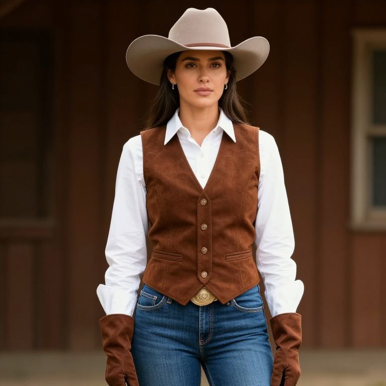 Female, wearing a cowboy hat, white shirt, brown vest, blue jeans, and brown gloves.