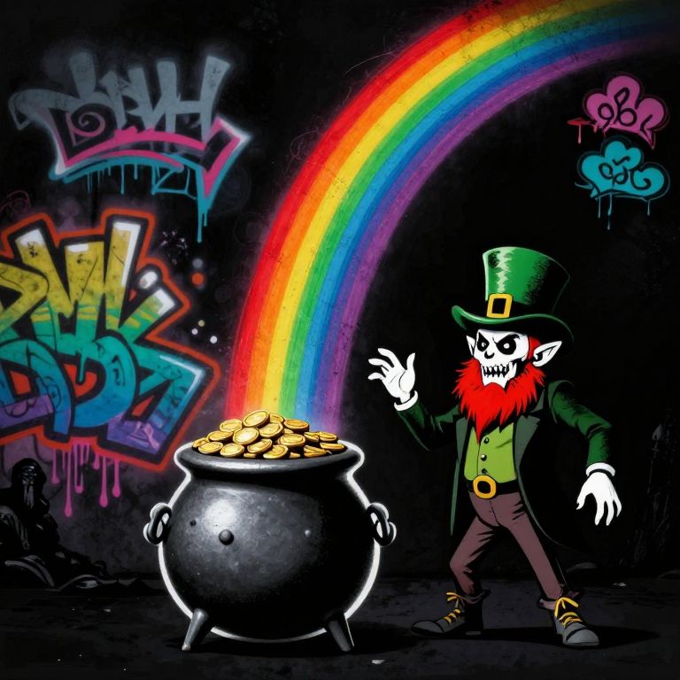 A Gothic rainbow leads to a pot of gold, accompanied by a scary horror leprechaun character next to the pot, set against a black background with vibrant, colorful graffiti, in the style of Banksy, with sharp focus and cinematic lighting.