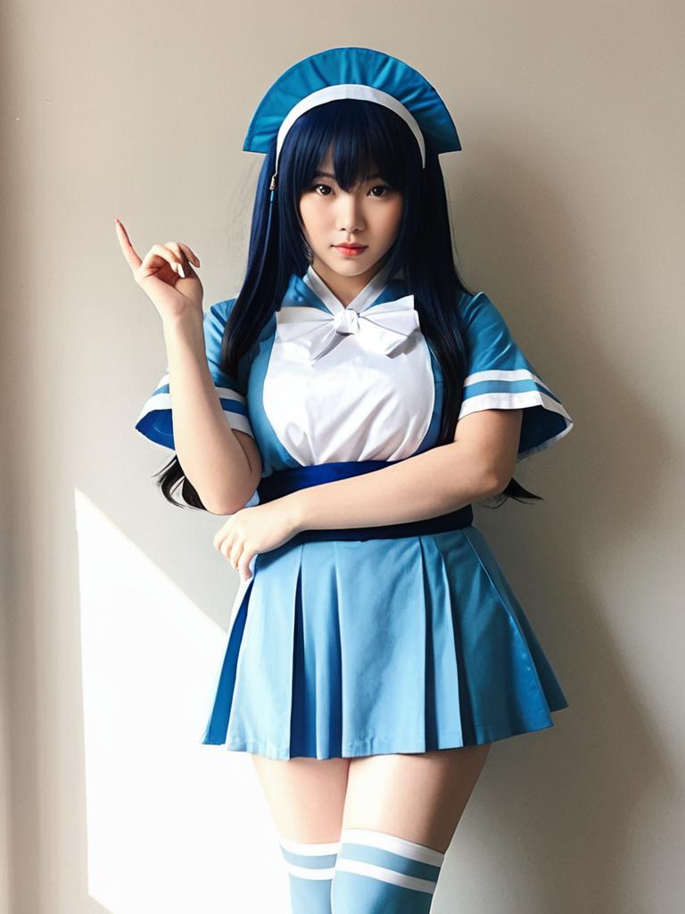 Full-length portrait of an Asian woman wearing a realistic Wendy Senju cosplay costume, featuring a blue and white dress with a bow, matching headpiece, and thigh-high socks. The outfit includes short sleeves with white stripes and a pleated skirt, inspired by the anime character Wendy Senju. The woman has long dark blue hair and stands against a neutral background with natural lighting.