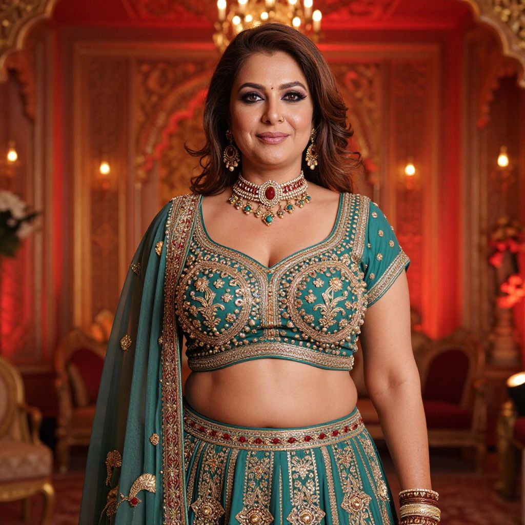 Photograph of a South Asian woman with medium brown skin and wavy, dark brown hair, standing in an ornately decorated room with red and gold lighting. She wears a traditional teal and gold embroidered lehenga set with a crop top and matching skirt, adorned with intricate patterns and a choker, necklace, and earrings with matching gemstones. Her makeup is bold with dark eyeliner and red lipstick. The background features luxurious, baroque-style furniture and a chandelier, adding to the opulent atmosphere. The woman's confident expression and elegant attire emphasize cultural heritage and traditional fashion.