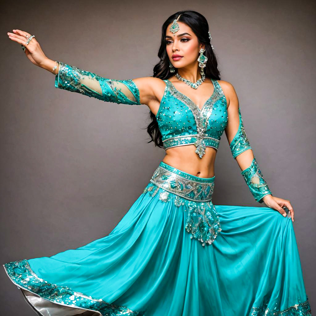 Belly dancer outfit, worn by graceful performer, featuring satin top and long sequin-embellished skirt, in vibrant turquoise and silver.