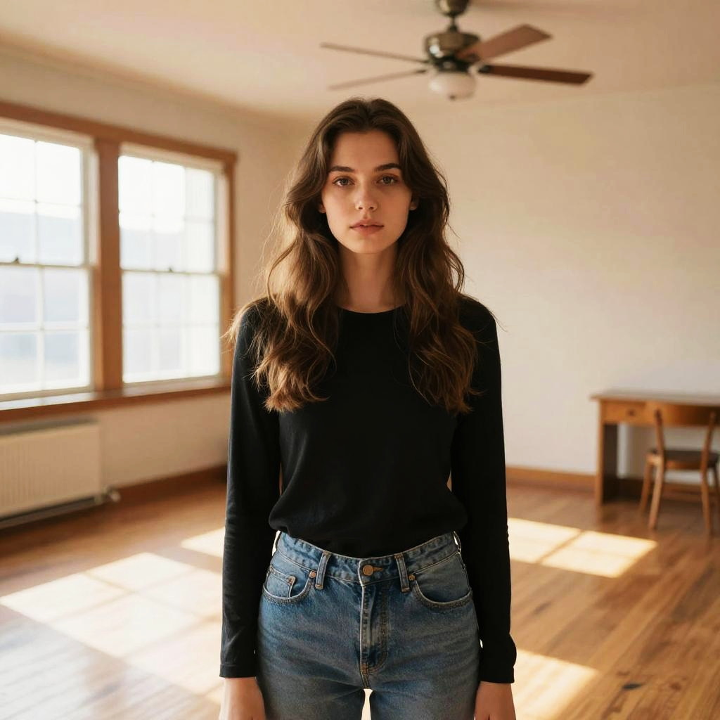 Photograph of a young woman with fair skin and long, wavy brown hair standing in a sunlit room with wooden floors and large windows. She's wearing a black long-sleeve shirt and blue jeans, looking directly at the camera with a neutral expression. The background shows a simple, empty room with a ceiling fan and wooden furniture. The light from the windows creates a warm, natural glow.