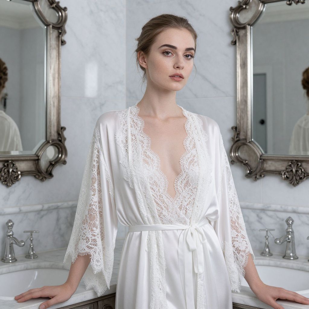 A elegant Belgian lace lady with fair skin, fine eyebrows, and soft brown lashes, standing in a marble-tiled bathroom with silver mirrors and vintage decor, dressed in a white lace robe that flows like silk, radiating delicate white elegance in a still, serene mood
