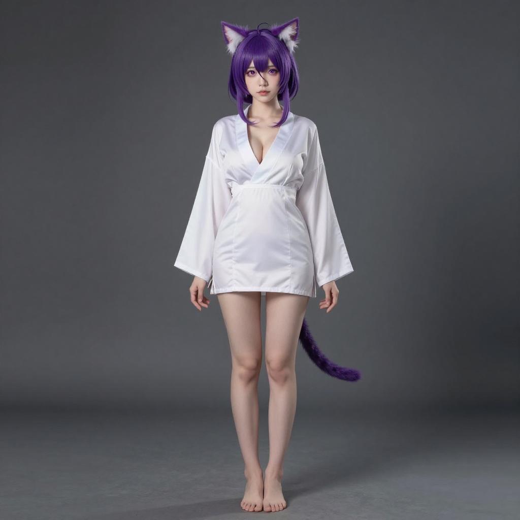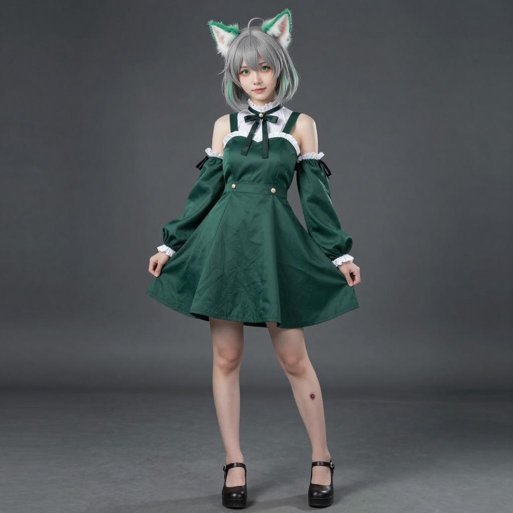 Photo-realistic cosplay photo of person in mon3tr (arknights) costume. Full body. Standing. Full length. 1girl, cat girl, monster, cat ears, animal ear fluff, green eyes, short hair, green hair, grey hair, white hair, green dress, bare shoulders, long sleeves, oripathy lesion (arknights), professional photoshoot