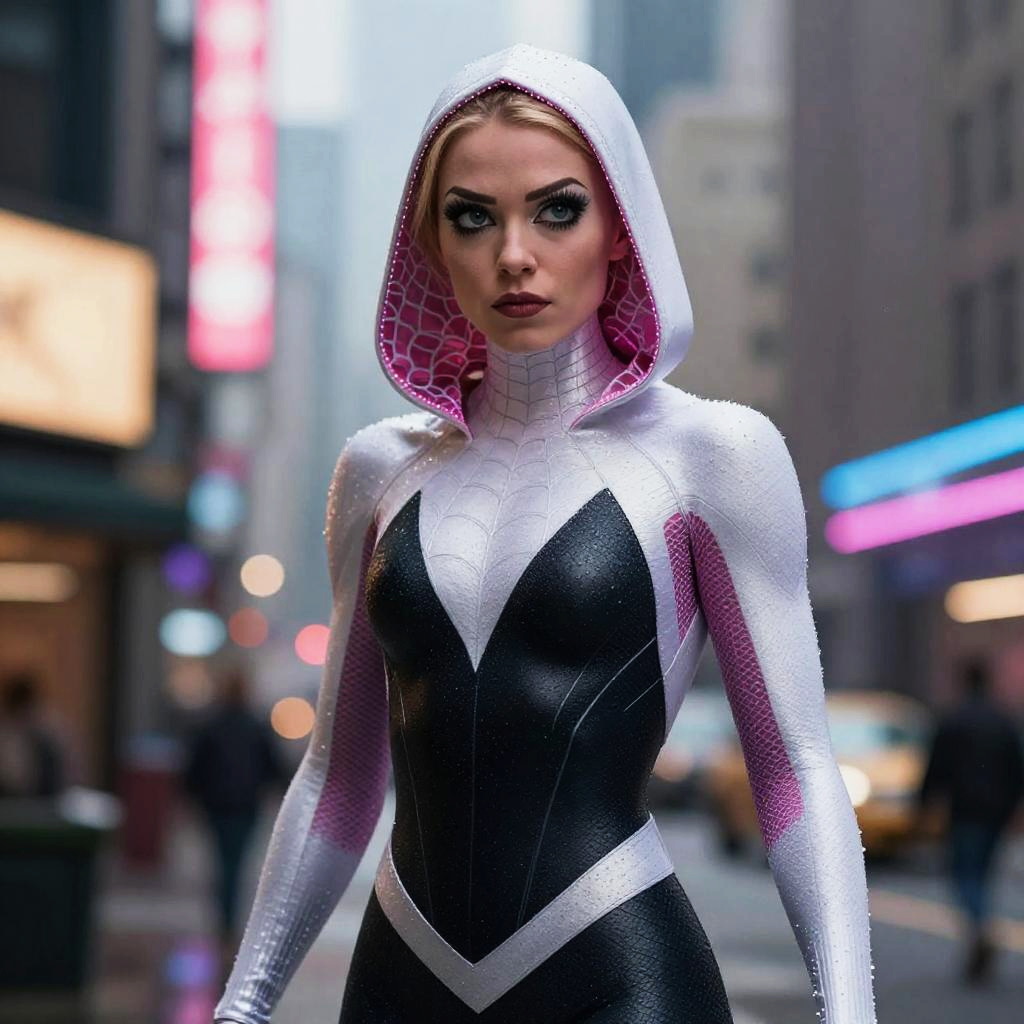 Photorealistic CGI of a blonde woman in a Spider-Woman costume with pink hood, white and black suit, standing on a neon-lit city