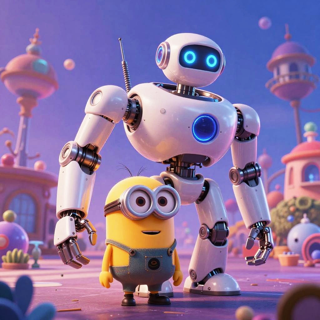 Pixar ai poster generator scene, advanced AI machine designing whimsical Pixar-inspired animated film posters with charming characters, bright colors, smooth gradients, imaginative backgrounds, soft shadows, intricate details, inspired by animation studio aesthetics