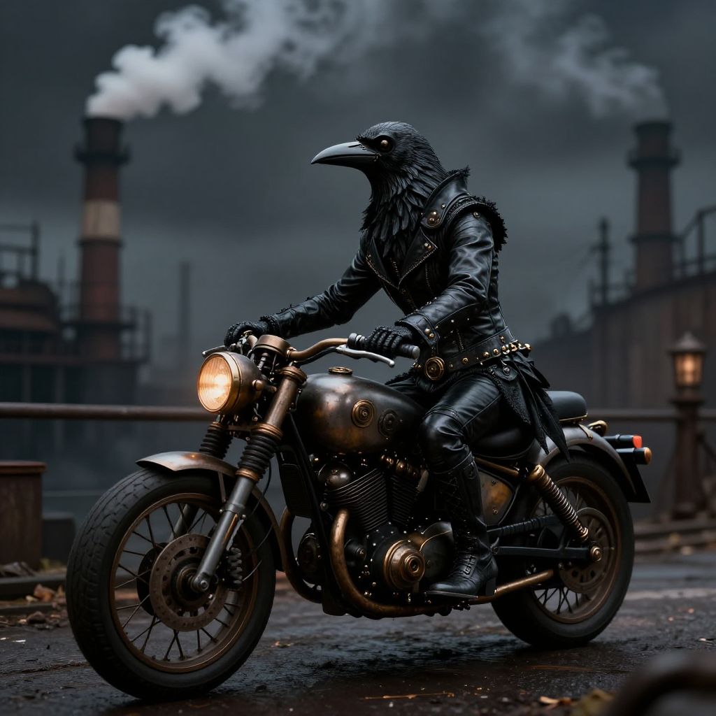 Photograph of a black crow in a black leather jacket and hat, playing an acoustic guitar, with a human hand visible.