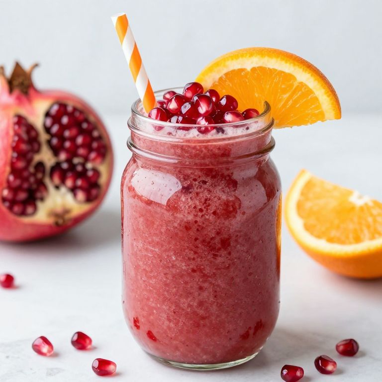 Photograph of a vibrant pink pomegranate smoothie in a mason jar, topped with pomegranate seeds and an orange slice. The jar has a white and orange striped straw. In the background, a halved pomegranate with visible seeds and a whole orange are slightly blurred, creating a fresh, colorful composition. Small pomegranate seeds are scattered on the white surface. The smoothie's texture appears thick and creamy, with a glossy finish. The image is brightly lit, highlighting the vivid colors and fresh ingredients.
