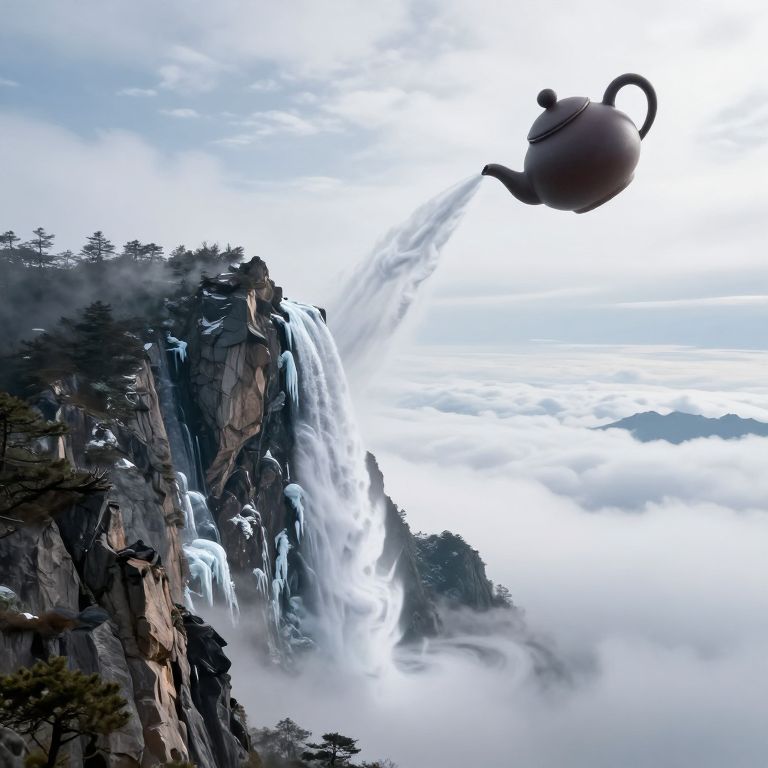 Photorealistic digital artwork: a black teapot mid-air, pouring water onto a misty, cliffside waterfall with ice formations, surrounded by clouds