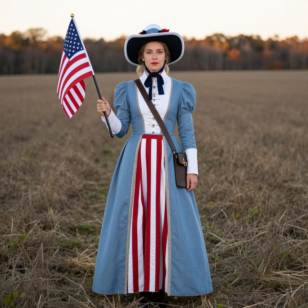 American revolution halloween costume, woman in a blue dress and hat standing in a field