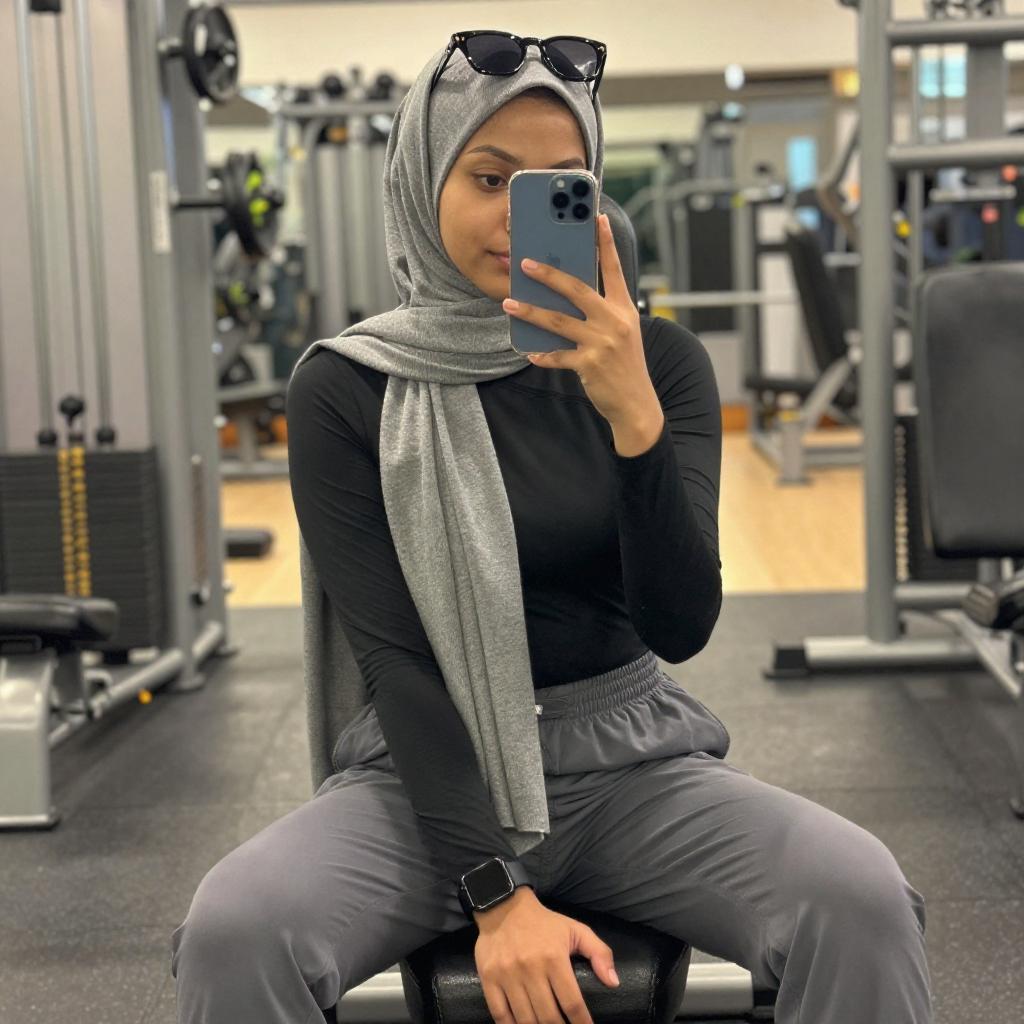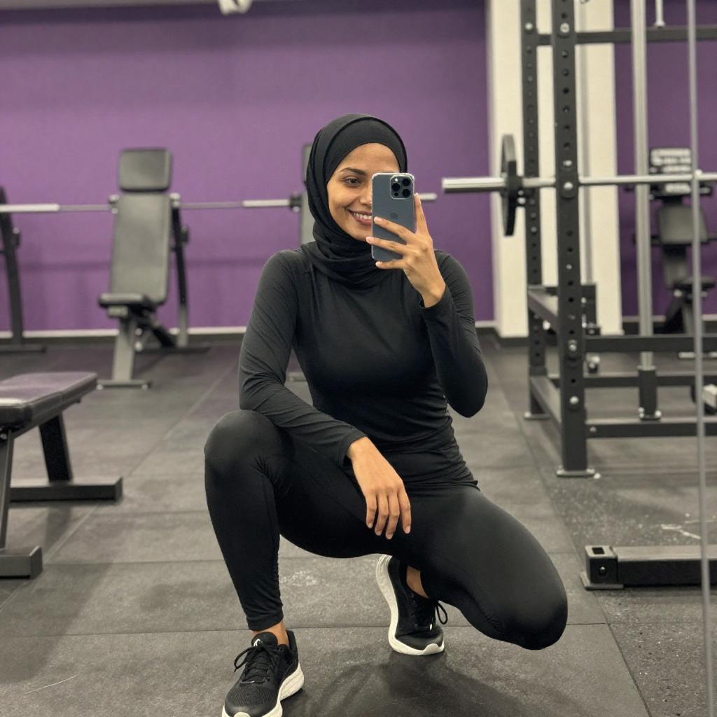 Photograph of a smiling woman with light brown skin and dark hair in a black hijab, squatting in a gym. She wears a black long-sleeve top, black leggings, and black sneakers with white soles. She holds a smartphone in front of her face, taking a mirror selfie. The gym has purple walls, a weight rack, and a bench in the background.
