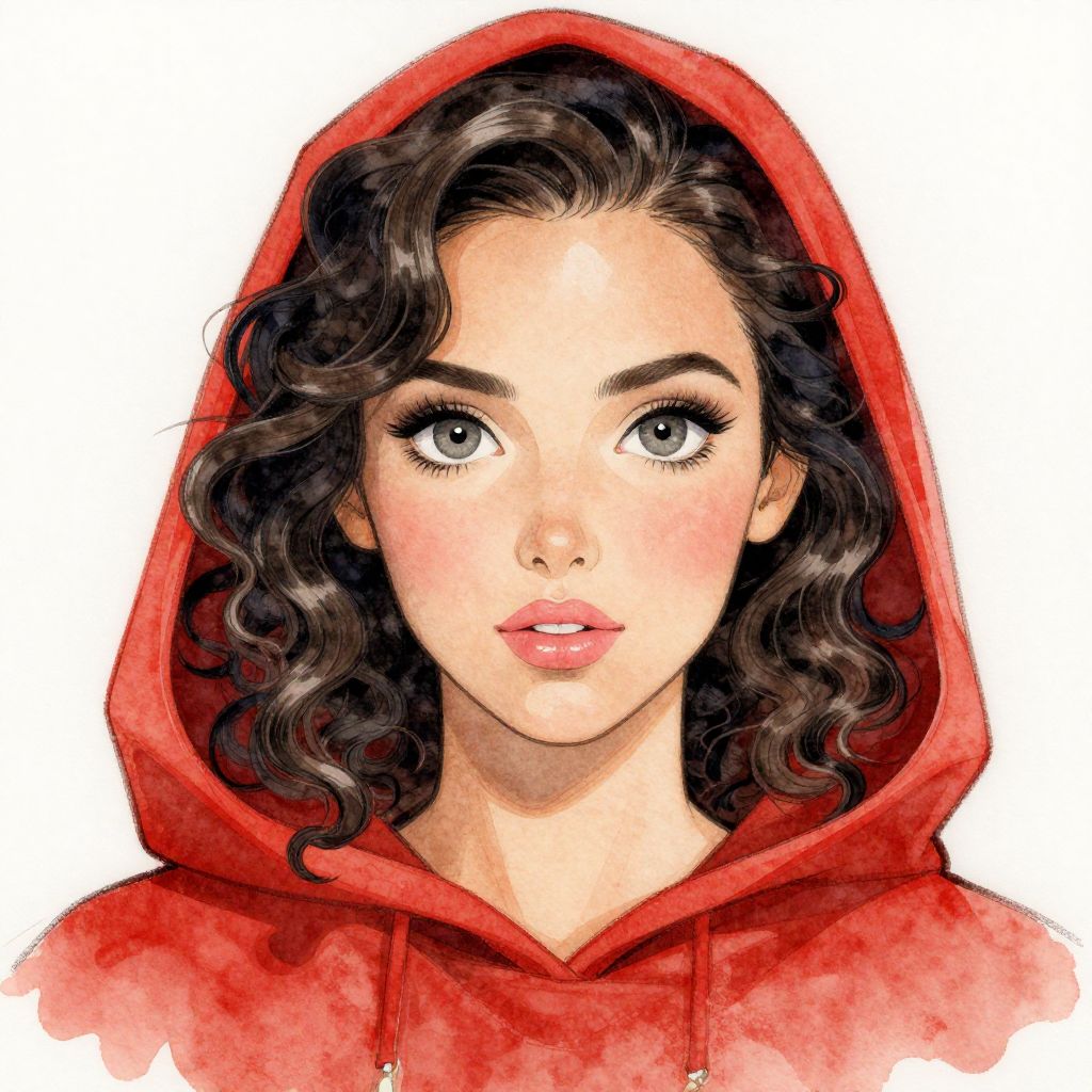 Contour a 30-year-old woman with a beautiful face, big gray eyes and a pink mouth, dark curls, in a red hooded cape, watercolor, roberto ferri,