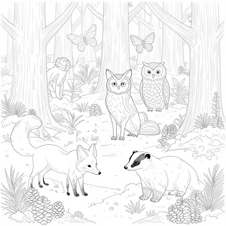 Detailed forest animals coloring page focused on a mix of animals like foxes, owls, badgers, and butterflies, surrounded by intricate natural elements including pine cones, moss, and tree bark textures, designed with clean outlines for coloring.