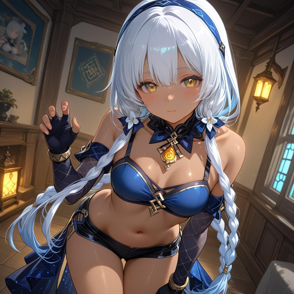 Mualani (genshin impact), genshin impact, 1girl, dark skin, red eyes, orange eyes, long hair, white hair, grey hair, light blue hair, blue hairband, low twin braids, braid, small breasts, thighs, navel, fingerless gloves, bare shoulders, midriff, stomach, by artist ichihaya, illustrious